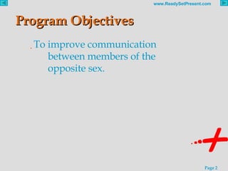 The document addresses the objectives of a program aimed at improving communication between genders, highlighting key differences in gender communication styles and values. It discusses how men often prioritize independence and power, while women focus on connection and relationships, along with communication strategies used by each gender. Additionally, it promotes a presentation resource that covers various topics related to gender differences in the workplace and offers insights into managing these disparities.