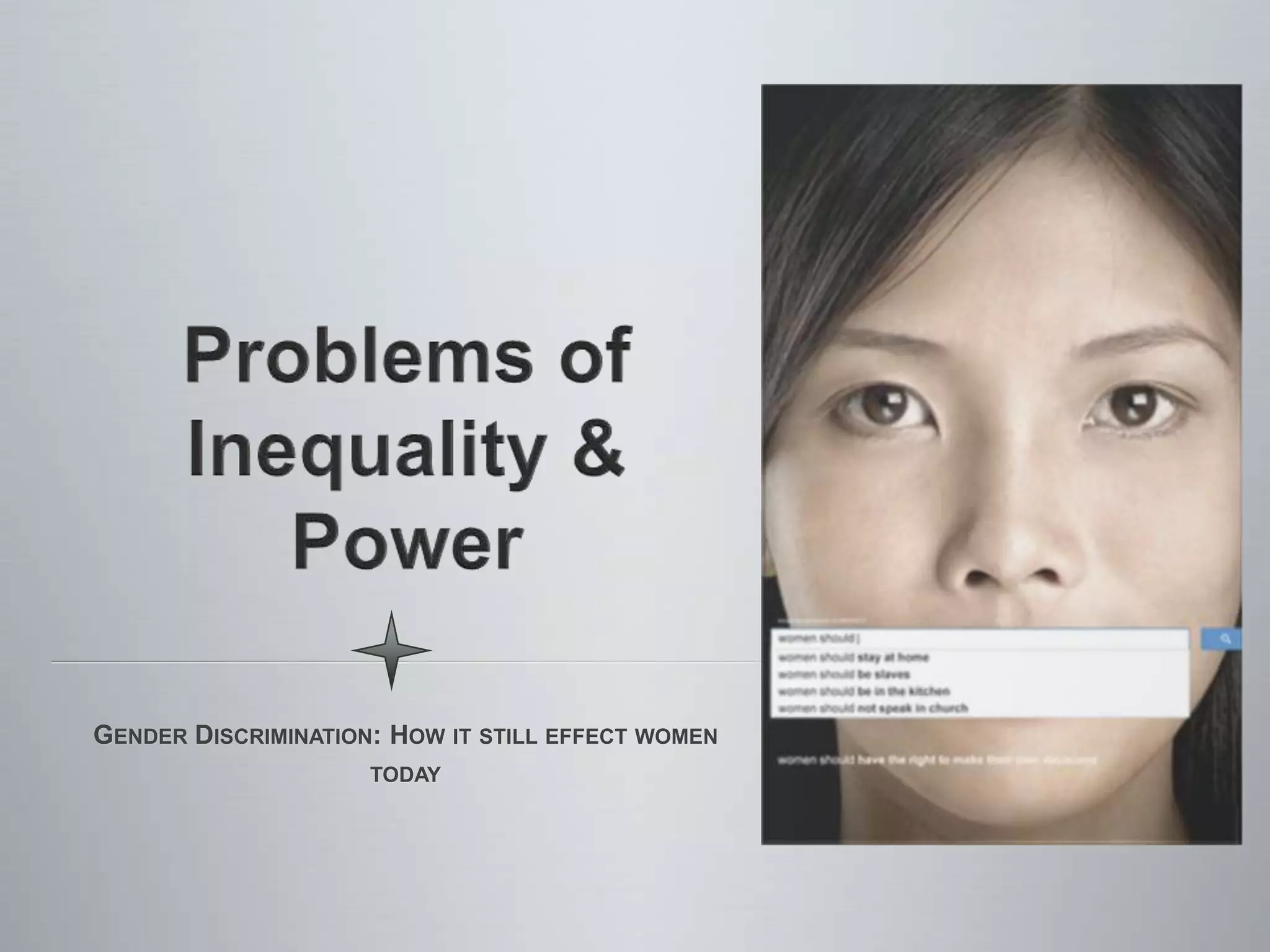 Gender discrimination still affects women in education, work, income, and culture. In education, women earn more post-secondary degrees than men but face direct, indirect, and harassment-based discrimination. At work, women are underrepresented in high-paying fields and top positions, and often face unequal pay and barriers to promotion compared to equally qualified men. Cultural gender discrimination perpetuates stereotypes through colors, toys, media, and parental socialization that steer women and men into traditional gender roles. While progress has been made, discrimination continues to disadvantage women in many countries worldwide.