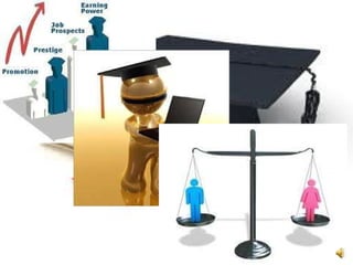 The document discusses how gender differences can impact success in online education. It suggests that catering courses to different learning preferences could increase achievement rates. Specifically, it notes that females tend to prefer social and collaborative learning while males tend to like independent and competitive activities. The document recommends designing online classes and technologies to suit these gender-based preferences in order to boost outcomes and meet the needs of a growing adult learner demographic.
