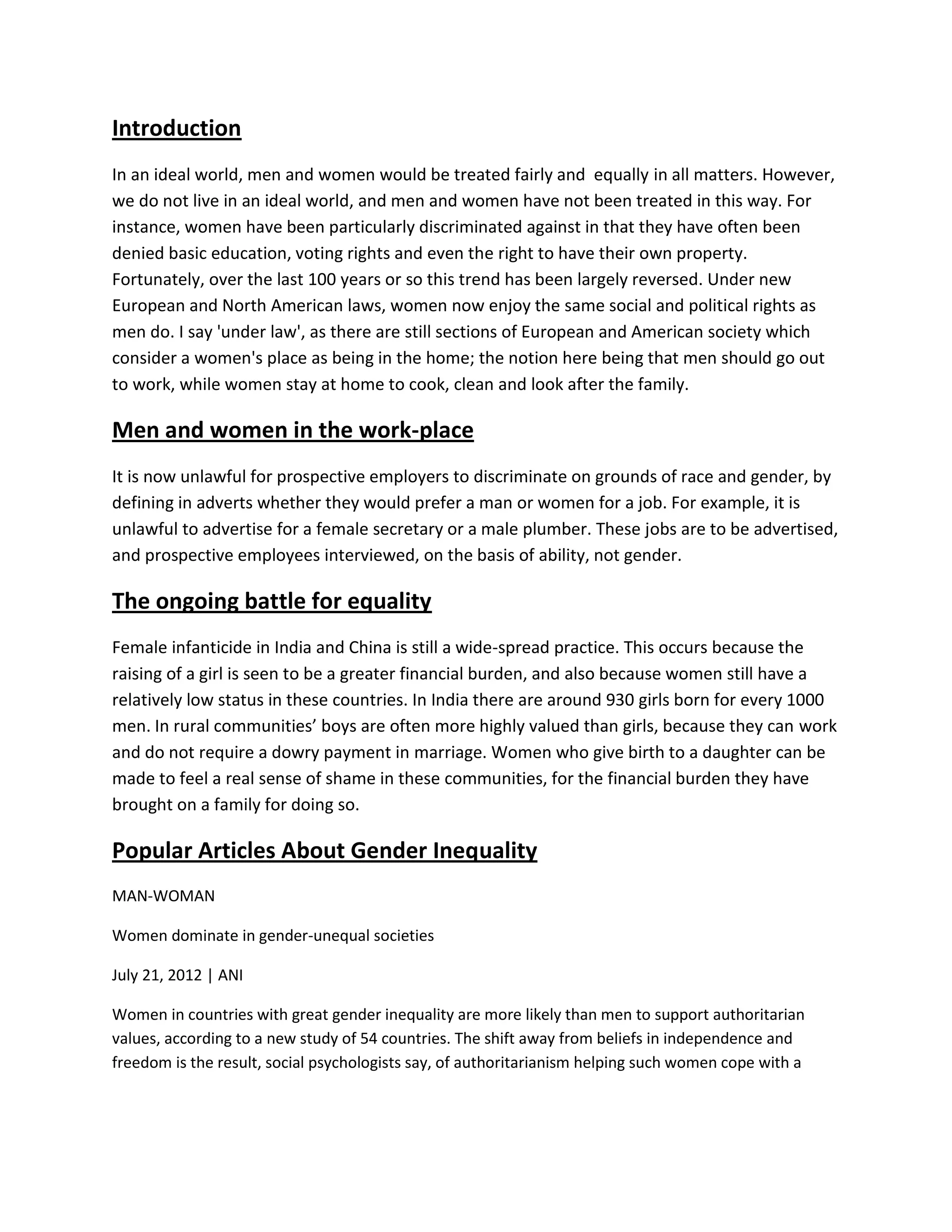 This document discusses gender inequality and discrimination against women globally. It provides examples of how women have faced barriers to basic rights like education and property ownership throughout history. While laws now provide equal rights, societal attitudes still favor traditional gender roles in some places. Specific issues discussed include female infanticide in India and China due to preference for boys, lack of access to divorce for women in some countries, and restrictions on women's activities and mobility in places like Saudi Arabia and Kashmir. The document also lists 10 extreme examples of gender inequality around the world.
