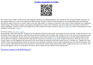 The one-act play Trifles by Susan Glaspell explores gender inequality in the early 20th century through the investigation of a murder. It depicts how the male characters dismiss the insights of the female characters as they search for clues in the murder victim's kitchen. While the men search elsewhere for evidence, Mrs. Hale and Mrs. Peters discover clues in the "trifles" of the kitchen that reveal the emotional abuse that likely led the wife, Minnie Wright, to murder her husband. The play shows how women's contributions were overlooked and how gender roles limited women at that time.