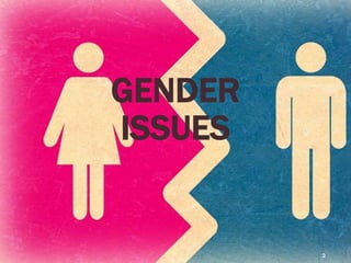 This document discusses gender issues in Pakistan. It defines gender and identifies three types: male, female, and transgender. For males, issues include same-sex marriage bans, marriage responsibilities, and expectations to be money-makers and protectors. Females face domestic violence, lack of education, sexual violence on campuses, dominance by males, honor killings, and forced/child marriages. Transgenders deal with disrespect, lack of jobs and education, and rejection by families and society. The document calls for legislation against offenses, educating males, and respecting all people equally.