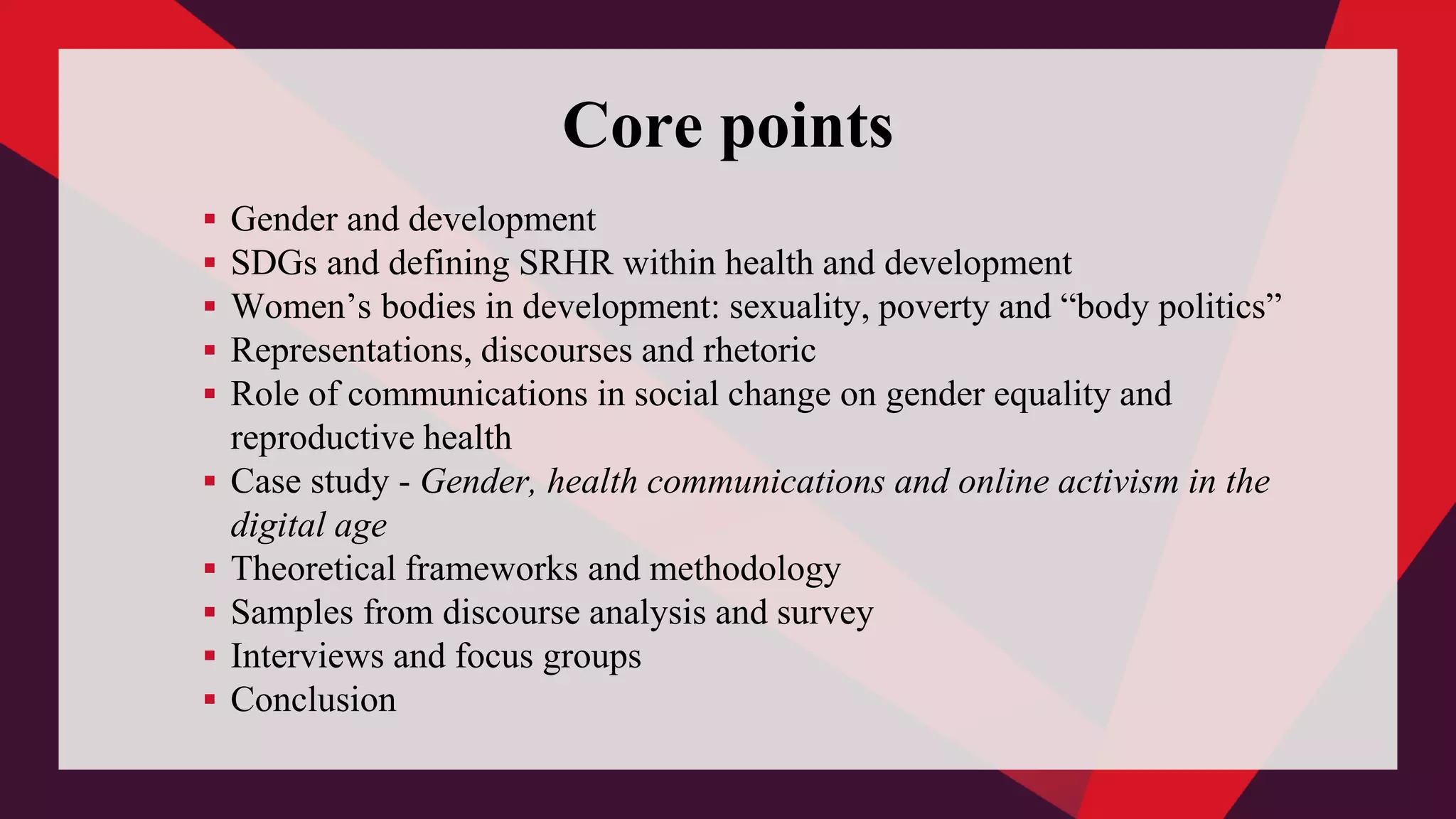 This document summarizes a presentation on using communications strategies to advocate for gender equality and reproductive health. It discusses frameworks for analyzing discourse around women's bodies in development. It also outlines challenges like conservative backlash against gender ideology and how COVID-19 has impacted goals. The presentation examines how feminist NGOs use online communications for advocacy and assesses their strategies, challenges, and role in shaping policy and public debate around sexual and reproductive health and rights.