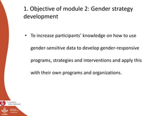 Module 2 focuses on gender strategy development to enhance participants' skills in creating gender-responsive programs and interventions. It covers topics such as recognizing gender approaches, developing gender equity visions, and designing gender mainstreaming strategies. The module aims to build core gender capacities across various levels, from individual to organizational, while assessing current capacities in gender-sensitive programming and budgeting.