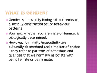 The document discusses how gender is a social construct rather than purely biological. It explores how traditional representations of masculinity and femininity in media enforced rigid gender roles and stereotypes. However, feminism in the 1960s challenged this patriarchal system and pushed for more equal representations. Today, gender roles are less defined but media still often relies on stereotypes for both female and male characters. While progress has been made, further work is still needed for portrayals to realistically reflect people's varied experiences.