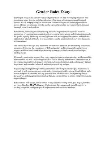 The document discusses the complexities of writing essays on various topics, particularly focusing on gender roles, career counseling theories, colonization in literature, universal human rights, and classroom management strategies. It emphasizes the importance of thorough research, empathy, and critical thinking in crafting well-supported arguments while navigating sensitive subjects. Additionally, it highlights the challenges faced by individuals in both their personal and academic lives, suggesting the need for reliable support and diverse perspectives in the writing process.