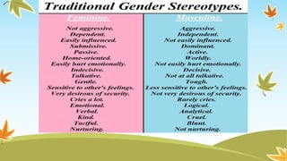 This document discusses gender sensitization and the differences between sex and gender. It explains that sex refers to biological characteristics that define males and females, while gender refers to socially constructed roles and behaviors associated with each sex. The document also discusses how gender is learned through socialization and conditioning rather than determined by biology alone. It emphasizes the importance of gender equality and equity in ensuring equal rights and opportunities for both women and men.