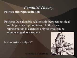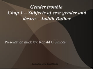 This document discusses several key aspects of feminist theory and politics related to gender, representation, and subjectivity. It addresses how political and linguistic representation often only extends to what can be acknowledged as a subject. It also examines how identity is socially constructed and assured through stabilizing gender norms, and how those who fail to conform to these norms may not be considered subjects. Finally, it discusses how power produces regulatory discourses that impose artificial binaries between sexes and internal coherence.