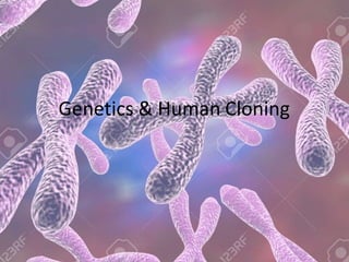 This document discusses genetics, the human genome project, genetic disorders, and arguments for and against human cloning. It defines key genetic terms like genes, alleles, and chromosomes. It explains the goals of the human genome project to map all human genes and help develop treatments for genetic diseases. Examples are given of single-gene disorders like sickle cell and cystic fibrosis. The document also discusses genetic counseling and concludes by outlining arguments both for and against human cloning.