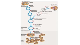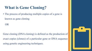 Gene cloning involves producing multiple copies of a gene using genetic engineering techniques. The main steps are: isolating the donor DNA fragment, inserting it into a vector, transforming host cells, and selecting recombinant cells containing the desired DNA insert. Gene cloning strategies include creating genomic DNA libraries, which contain all DNA from an organism's genome, and cDNA libraries, which contain only coding regions created from mRNA. Genomic libraries contain both coding and non-coding regions from genomes, while cDNA libraries contain only coding exons synthesized from mRNA using reverse transcriptase.