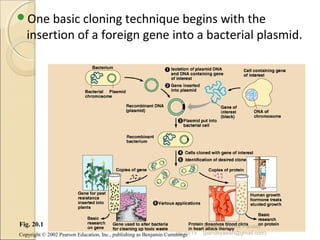 The document discusses cloning and recombinant DNA technology. It defines cloning as making identical copies of a molecule such as a gene. Recombinant DNA technology allows genes to be isolated, modified, and expressed in new hosts. One technique is inserting a foreign gene into a bacterial plasmid, which then replicates and produces multiple copies of the gene. Restriction enzymes and ligases are used to cut and paste DNA fragments for cloning.
