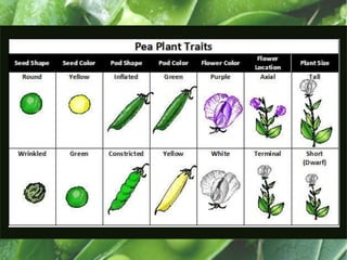 1) Gregor Mendel studied inheritance through experiments breeding pea plants. He found that traits are passed from parents to offspring through discrete factors that he later called genes.