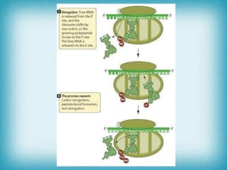 Gene expression involves two key processes - transcription and translation. Transcription is the process where the DNA code for a protein is copied into an mRNA molecule with the help of RNA polymerase. The mRNA then travels to the cytoplasm, where during translation it attaches to ribosomes. Ribosomes read the mRNA code and add amino acids brought by tRNA molecules to produce a polypeptide chain, completing protein synthesis.