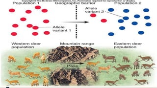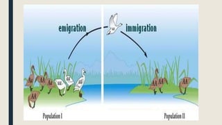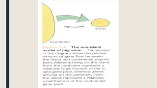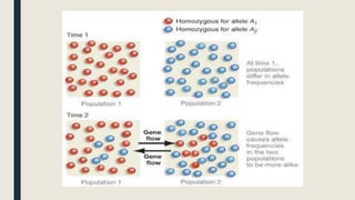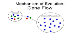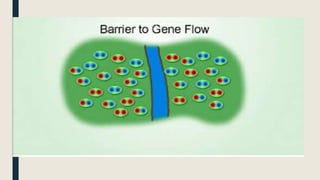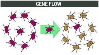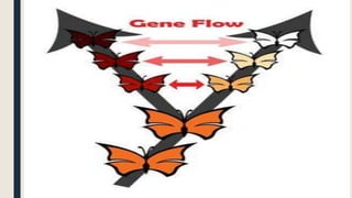 The document discusses gene flow, defining it as the transfer of alleles between populations, which can impact allele frequencies and affect population genetics. It outlines key concepts such as mutation, migration, natural selection, and genetic drift, explaining their roles in shaping genetic diversity. Additionally, it addresses factors influencing gene flow, barriers to gene exchange, and the implications for speciation and natural selection.