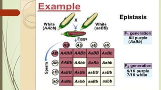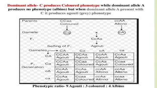 This document discusses gene interaction and epistasis. It defines gene interaction as when the expression of one gene depends on the presence or absence of another gene. Epistasis occurs when one gene masks or interferes with the expression of another. There are several types of epistatic interactions including dominant epistasis, recessive epistasis, dominant inhibitory epistasis, duplicate dominant epistasis, and duplicate recessive epistasis. Examples are provided for each type.