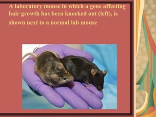 Gene knock out technology involves replacing or disrupting an existing gene with artificial DNA to study gene function. The first knockout mouse was created in 1989. Knockout mice and microorganisms are commonly used animal models for studying genes in the laboratory. The procedure involves isolating the target gene, engineering a new DNA sequence with a marker gene, introducing this into stem cells via electroporation, and breeding mice with the knocked out gene. Knockout technology allows determining gene functions, creating mouse models of human diseases, and characterizing genetic regulatory regions.