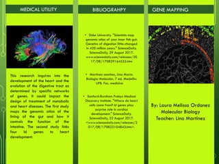 This document summarizes two scientific studies on gene mapping. The first study mapped the genomic atlas of the gut lining and found that genetics of digestion have remained largely unchanged over 420 million years, controlled by conserved regulatory elements. The second study identified four Id genes essential for heart development in mice through CRISPR gene editing. Manipulation of these genes may help regenerate damaged heart tissue. Together, the studies provide insights with potential applications in treating metabolic and heart diseases.