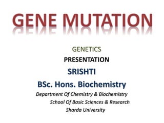 The document discusses different types of mutations including chromosomal mutations and genetic mutations. It defines gene mutations as mutations that change the function of a gene by altering its polynucleotide sequence. The types of gene mutations described include insertion, deletion, inversion, substitution, duplication, silent mutation, missense mutation, nonsense mutation, and frameshift mutation. Each mutation type results from a different change to the gene sequence, such as the addition, removal, inversion, or replacement of nucleotide bases.