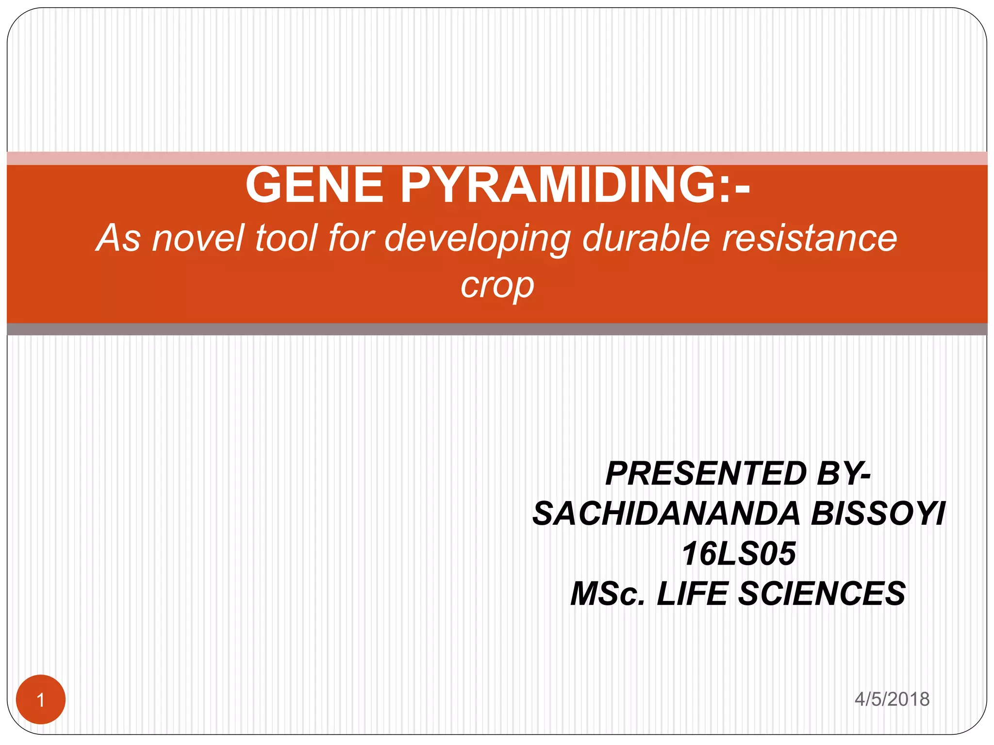 This document discusses gene pyramiding as a tool for developing durable resistance in crops. It defines gene pyramiding as combining two or more genes from multiple parents to develop elite lines with simultaneous expression of multiple genes. The objectives of gene pyramiding are to enhance traits, meet deficits in elite cultivars, and increase durability. Types of gene pyramiding include conventional pedigree breeding and backcrossing as well as molecular marker-assisted selection and transgenic methods. Gene pyramiding provides advantages like wider disease resistance and improved elite cultivars, while limitations include difficulty achieving multiple gene incorporation. Examples and applications in rice, wheat and other crops are also provided.