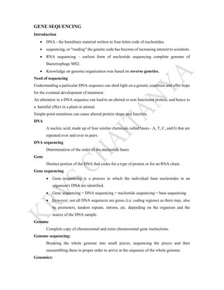 Gene sequencing is the process of determining the order of nucleotides in a gene or genome. It allows scientists to understand how alterations in DNA sequences can cause genetic conditions or affect protein function. There are several methods for gene sequencing, including Sanger sequencing which uses chain termination with dideoxynucleotides, and next generation sequencing techniques like pyrosequencing. Gene sequencing provides insight into genetic variations and metabolic pathways that can aid disease research and treatment development.