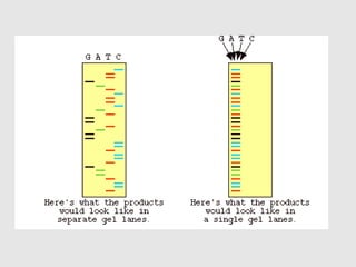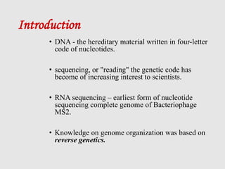 This document discusses various gene sequencing methods. It begins by introducing DNA and the importance of sequencing the genetic code. It then describes several early sequencing techniques like Sanger sequencing using chain termination or chemical cleavage. It discusses the need for sequencing to understand genetic conditions. The document also covers topics like genome sequencing, genomics, and high-throughput sequencing techniques like dye-terminator sequencing which replaced radioactive labels with fluorescent labels to automate the process.