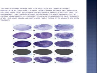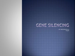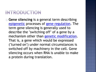 Gene silencing refers to epigenetic processes that regulate genes by switching them off without genetic modification. There are two main types: transcriptional gene silencing modifies chromatin to make genes inaccessible for transcription, while post-transcriptional gene silencing destroys or blocks mRNA to prevent translation into proteins. Both mechanisms protect organisms from transposons and viruses by silencing foreign DNA. Gene silencing is an ancient immune response and also regulates endogenous genes during processes like meiosis.
