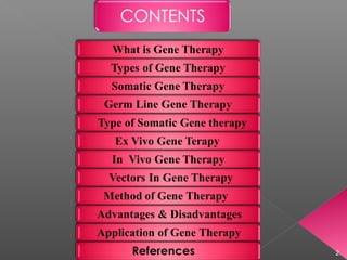 The document discusses gene therapy, which involves inserting normal genes into patients to replace abnormal genes that cause diseases. The first approved gene therapy experiment occurred in 1990 when a 4-year-old girl with severe combined immunodeficiency was treated. There are two main types of gene therapy - somatic cell gene therapy, which treats cells in the body but is not inherited, and germ line gene therapy, which treats eggs and sperm and can be inherited but has safety and ethical concerns. Viruses are commonly used as vectors to deliver therapeutic genes directly to tissues or cells can be removed and treated ex vivo before being returned to the body. While gene therapy holds promise, it also faces challenges and risks that require further research.