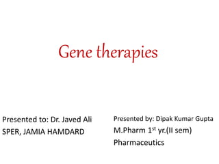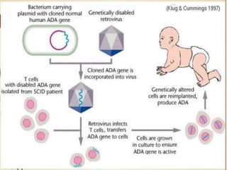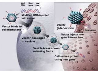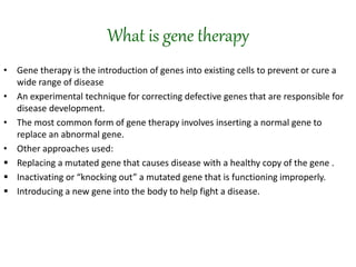 Gene therapy involves introducing genes into cells to treat or prevent disease. It works by delivering a therapeutic gene into a patient's target cells using a vector. This can replace an abnormal gene with a healthy one, inactivate a mutated gene, or introduce a new gene to fight disease. There are two main types - somatic gene therapy only affects treated cells while germline gene therapy results in permanent changes that can be inherited. Approaches include ex vivo gene therapy, which modifies cells outside the body before transplant, and in vivo gene therapy through direct delivery. While gene therapy holds promise to cure genetic diseases, it faces challenges like short-lived effects and safety risks.