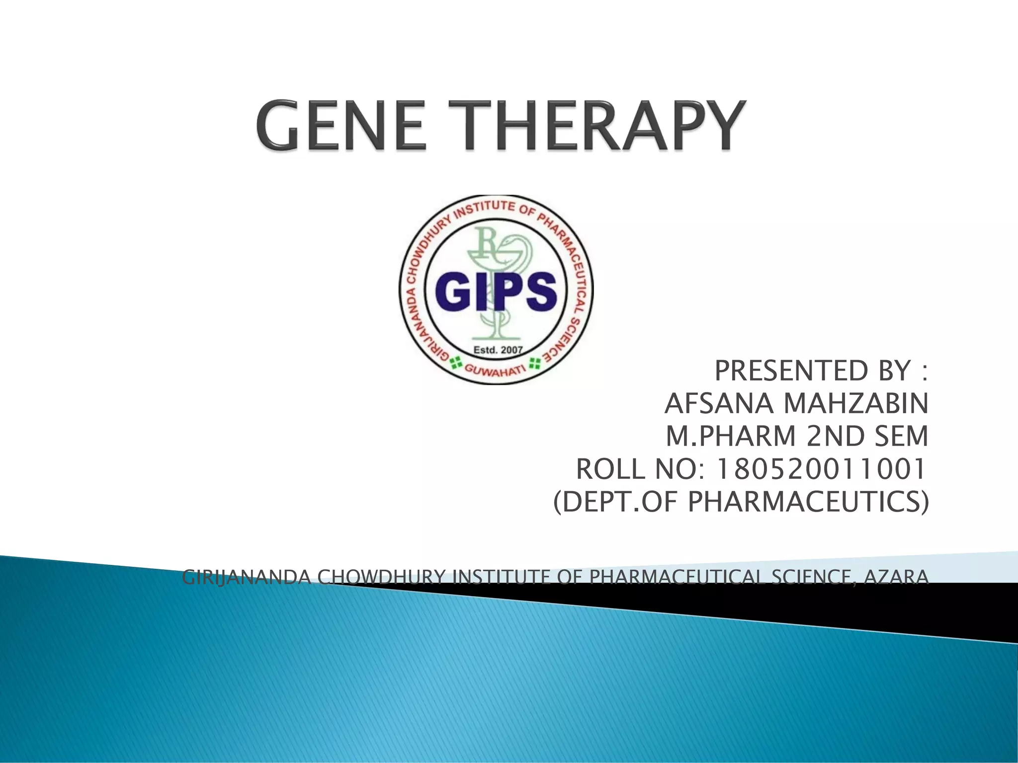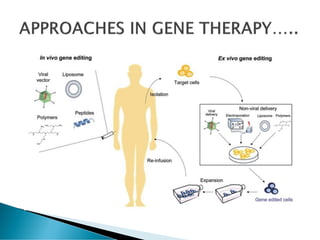 This document provides an overview of gene therapy. It defines gene therapy as an experimental technique for correcting defective genes responsible for disease. It describes the main approaches like somatic cell gene therapy and germline gene therapy. It also discusses viral and non-viral vectors, delivery methods like in vivo and ex vivo, advantages like curing genetic diseases, and challenges like short-term effects and safety issues. Recent developments show promise for treating diseases like blindness and Parkinson's.