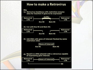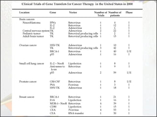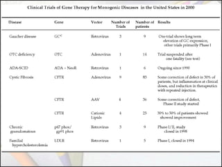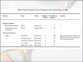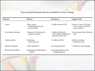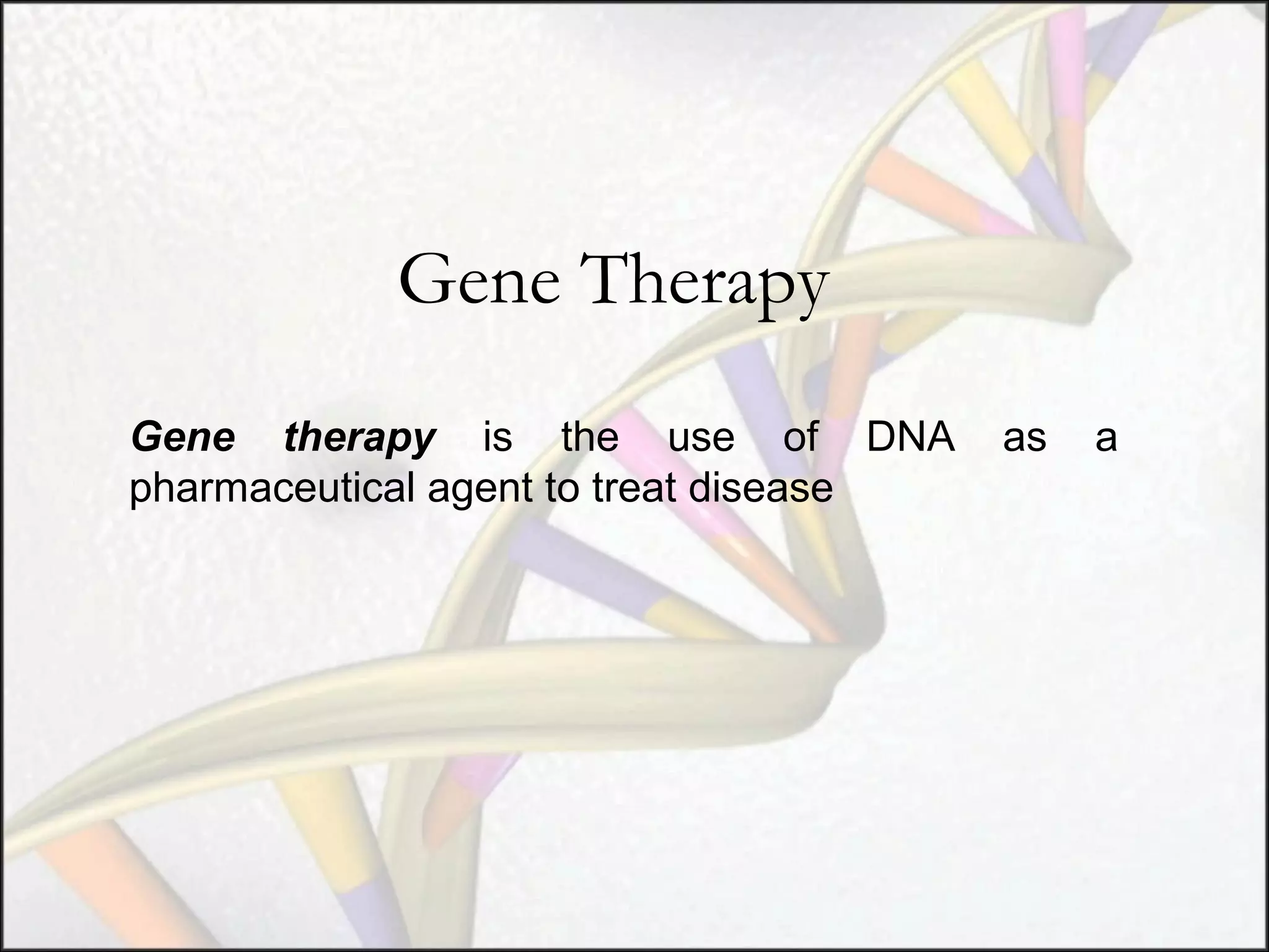 Gene therapy involves using genes as pharmaceutical agents to treat disease. There are four main approaches to gene therapy: inserting a normal gene to compensate for a nonfunctional one, suppressing abnormal gene expression, repairing an abnormal gene through selective reverse mutation, or changing gene regulation. Gene therapy aims to cure the underlying causes of diseases, whereas conventional therapies usually just relieve symptoms. Gene therapy also has the potential for permanent or inheritable effects, unlike most conventional therapies. Common methods for delivering genes include viral vectors like retroviruses, adenoviruses, and AAV, as well as non-viral methods like naked DNA, electroporation, and liposomes.