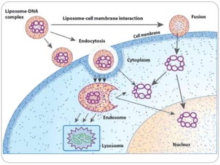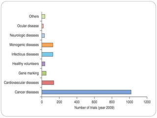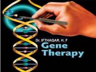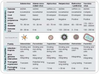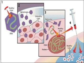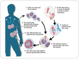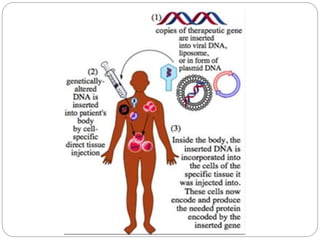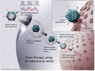 Gene therapy involves inserting a normal gene into a patient's cells to replace a defective gene that causes disease. There are two main types of gene therapy: somatic cell therapy, which treats the individual patient, and germline therapy, which could affect future generations. The two most common methods of delivery are ex vivo therapy, where cells are removed and modified before being returned, and in vivo therapy through direct injection. Retroviruses and adenoviruses are the most widely used vectors for transporting genes, but each has advantages and disadvantages for successful gene expression and integration. While promising for treating many diseases, gene therapy still faces challenges from issues like gene silencing, immunogenicity, and potential safety risks that require more research.