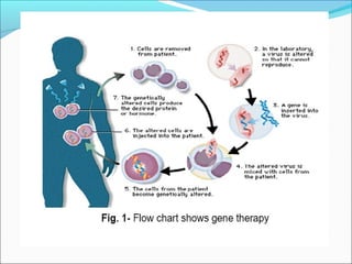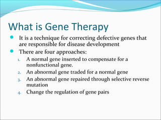 Gene therapy involves techniques that modify or manipulate genes to treat or prevent diseases. The first gene therapy treatment occurred in 1990 for severe combined immunodeficiency. There are four main approaches to gene therapy: inserting a normal gene to compensate for a defective one, replacing an abnormal gene with a normal one, repairing an abnormal gene, or altering gene regulation. Viruses are commonly used as vectors to deliver therapeutic genes into target cells, with retroviruses, adenoviruses, adeno-associated viruses, and herpes simplex viruses being some of the most widely used viral vectors, each with advantages and limitations.
