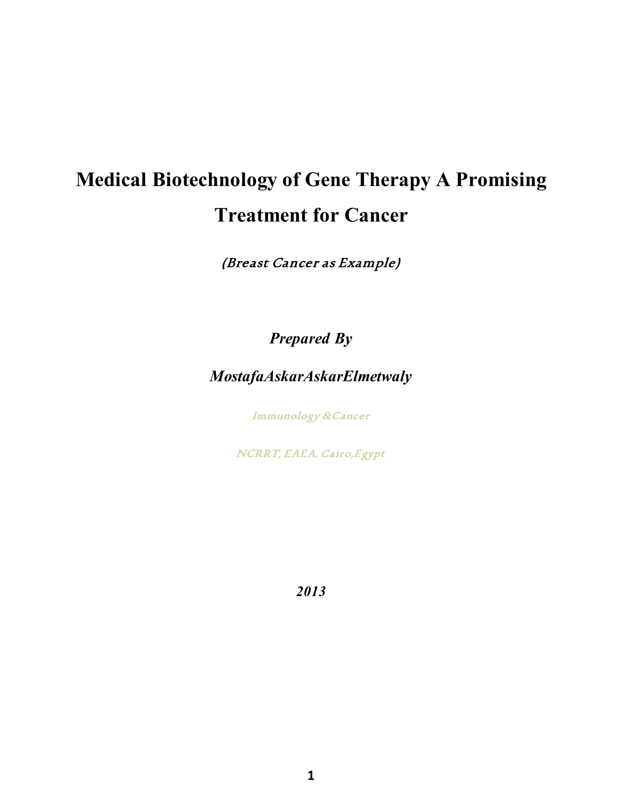 This document discusses gene therapy as a promising treatment for breast cancer. It begins by providing background on breast cancer prevalence and current treatment options. It then describes how gene therapy could target mutated genes, cancer cell markers, block metastasis, and induce apoptosis. The document focuses on gene therapy approaches for breast cancer, including using antisense technology to inhibit pathogenic genes, RNA interference to downregulate genes like c-myc, and suicide genes to make cancer cells more sensitive to chemotherapy.