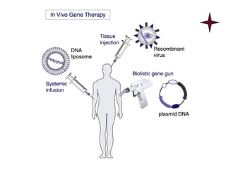 The document discusses gene therapy, a technique for correcting defective genes responsible for diseases, outlining its history, methods, and various vector types used for gene delivery. Key approaches include inserting normal genes, repairing abnormal ones, and changing gene regulation, with notable applications in conditions like cystic fibrosis and severe combined immunodeficiency. Challenges include effective delivery, stable expression, and potential immunological responses, with current research focusing on improving these aspects for better treatment outcomes.