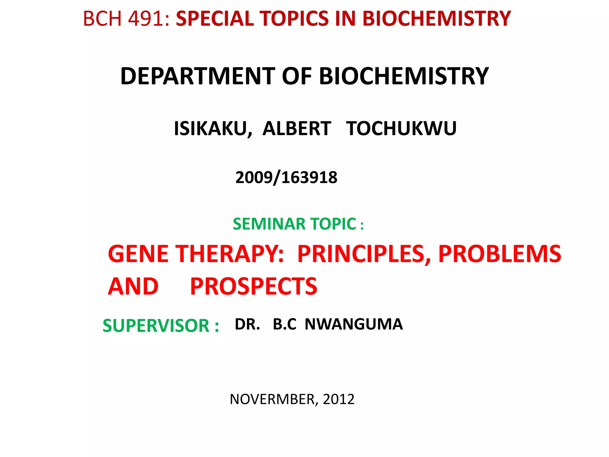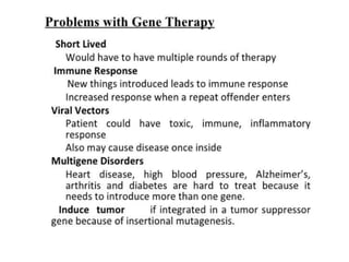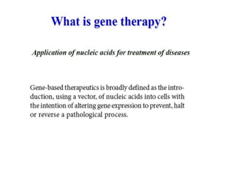 This document summarizes a seminar presentation on gene therapy. It discusses the basic principles of genes and gene therapy, including how genes encode proteins and how mutations can cause disease. It describes the two main types of gene therapy - somatic and germline. It also outlines some viral vectors used, methods of gene transfer like ex vivo and in vivo, diseases that may be treatable with gene therapy, prospects of the approach, and concludes that further development is needed but gene therapy has potential to benefit humanity.