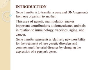 This document discusses various methods for transferring genes into animal cells, including viral and non-viral approaches. Viral methods use viruses like adenovirus to transfer genes, while non-viral methods include biochemical techniques like calcium phosphate transfection, lipid-mediated transfection using lipofectamine, and physical methods like microinjection, particle bombardment/gene guns, ultrasound, and electroporation. The document provides detailed protocols for lipid-mediated transfection and some of the other non-viral methods.