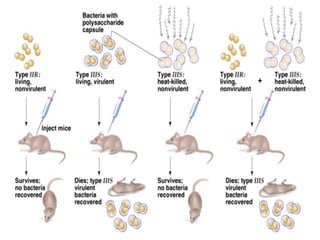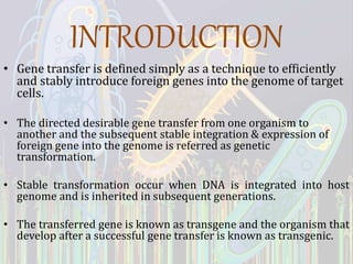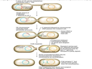 This document provides an overview of gene transfer in bacteria through three main methods: conjugation, transformation, and transduction. Conjugation involves the transfer of genetic material between bacteria via cell-to-cell contact through sex pili. Transformation refers to the uptake of naked DNA by competent bacterial cells. Transduction is the transfer of DNA from one bacterium to another via bacteriophage. Each method is described in 1-2 paragraphs detailing its history of discovery and basic mechanisms.