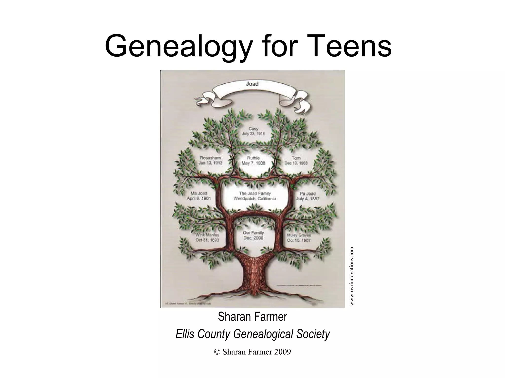 This document provides an introduction to genealogy research for teens. It outlines the basics of genealogy as tracing one's family lineage through records of ancestors, their births, marriages and deaths. It encourages starting with information known about immediate family and interviewing relatives, then verifying facts with primary sources like birth certificates, census records, and military records found at libraries and archives. Secondary sources like family histories and newspapers can also provide clues but require verification. The document stresses documenting sources, collecting photographs to tell stories, and sharing information with family, as the research is ongoing and never truly complete.