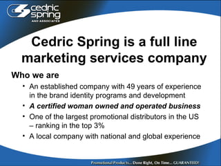 Cedric Spring & Associates is a full-service marketing company with 49 years of experience. They offer a wide range of branding and promotional services including product sourcing, design, warehousing and fulfillment to help companies strengthen their brand image. Their mission is to use promotional products creatively and cost-effectively to support business relationships and the bottom line.