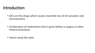 The document provides an overview of general anesthesia (GA), detailing its characteristics, mechanisms of action, stages, classification, and specific agents used in GA. It differentiates GA from local anesthesia (LA), outlines the pharmacological effects of various anesthetics, including inhalation and parenteral options, and discusses their respective advantages and side effects. The document also references medical texts for further reading on pharmacology.