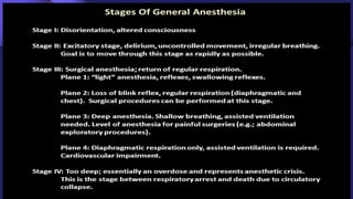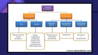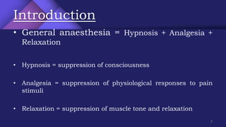General anesthesia is a controlled, reversible state characterized by amnesia, analgesia, akinesia, and reflex blockade achieved through a combination of drugs. It is indicated for patients who cannot cooperate for procedures, extreme anxiety, or significant medical conditions, but presents risks such as impaired protective reflexes and the need for specialized assistance. Various theories explain its mechanism, with the membrane expansion theory being widely accepted, alongside considerations for preoperative evaluation, patient preparation, and the use of specific anesthetic agents.