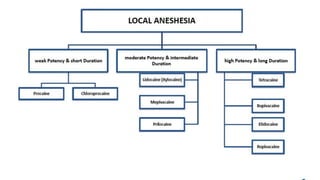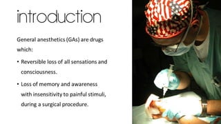 General anesthetics are drugs that induce reversible loss of consciousness and sensations during surgery. They work by depressing the central nervous system in stages, starting with cortical centers and ending with the medulla. There are two main types - inhalational gases administered through masks or intravenous drugs given through injections. A balanced anesthesia approach uses multiple drugs to induce unconsciousness, amnesia, analgesia, and muscle relaxation. Precise drug combinations and dosages are tailored for each patient and procedure type. The goal is to smoothly induce and rapidly recover from anesthesia with minimized risks and side effects.