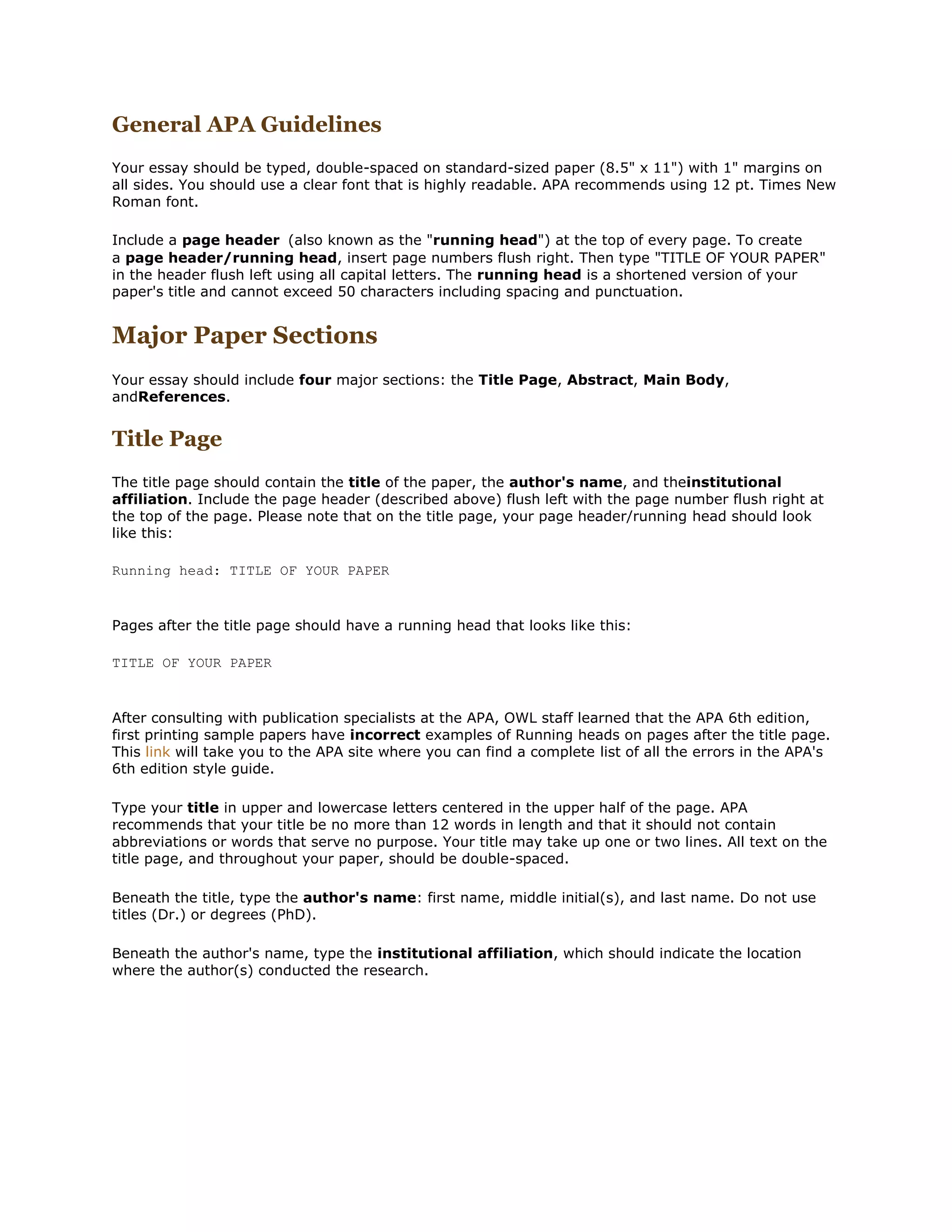 The document provides guidelines for formatting an APA-style paper. It discusses formatting the paper, including using 12-point Times New Roman font, double-spacing, and 1-inch margins. It recommends including a running head on every page, as well as four major sections: the title page, abstract, main body, and references. The title page should include the title, author's name, and institutional affiliation. The abstract page should include the word "Abstract" centered at the top, followed by a 150-250 word summary of the paper.