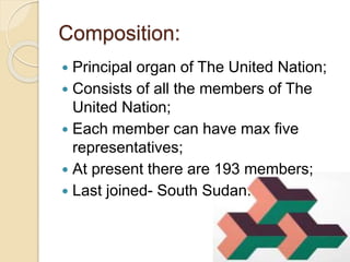 The General Assembly is the principal organ of the United Nations, consisting of all UN member states, with each member having a maximum of five representatives. It currently has 193 members. The General Assembly has powers including electing non-permanent Security Council members and other UN bodies, approving the budget, and initiating studies on international issues. It can make recommendations and declarations on international matters, but its resolutions are not binding. Voting is based on the principle of one member, one vote, with decisions requiring a two-thirds majority.