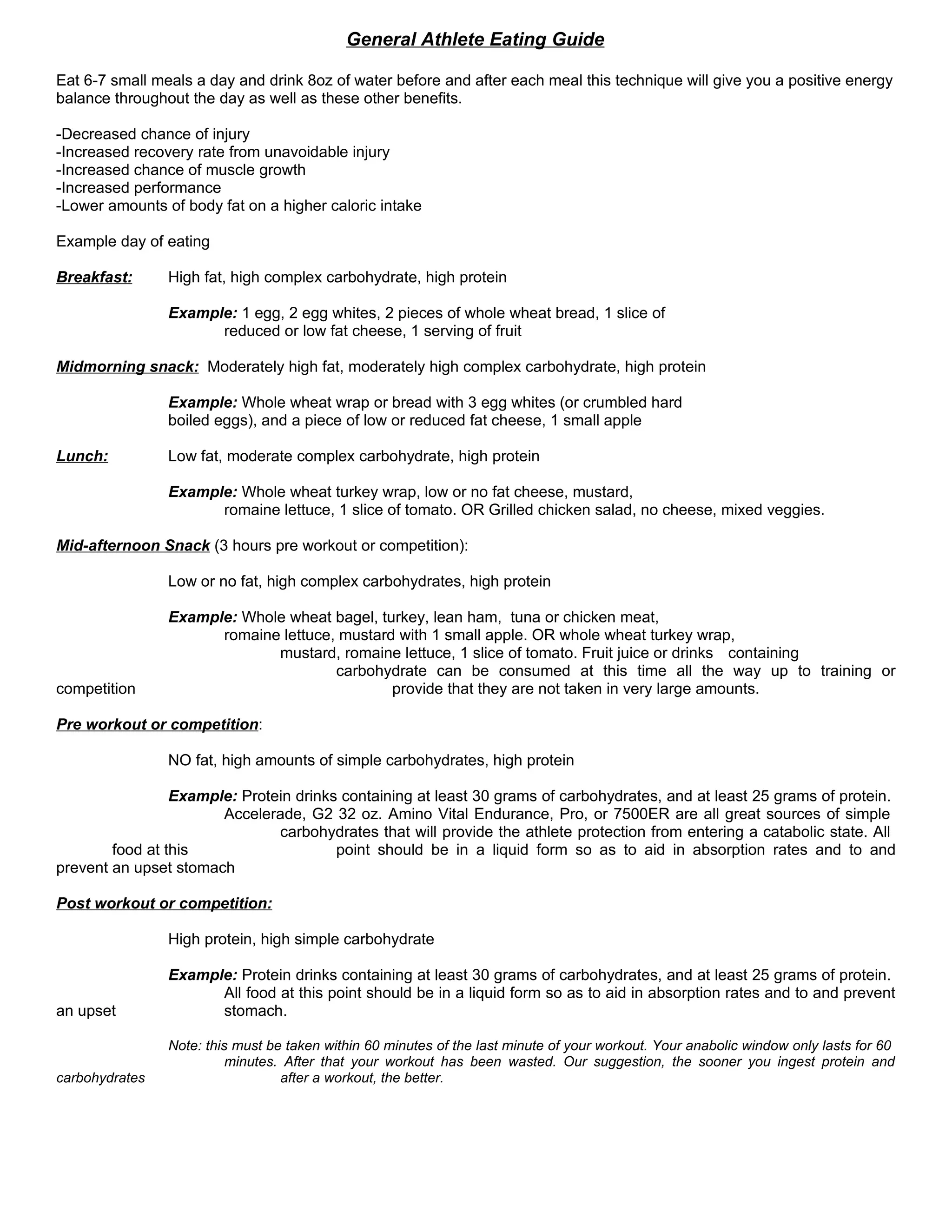 This document provides guidelines for optimal nutrition and hydration for athletes. It recommends eating 6-7 small meals per day and drinking 8oz of water before and after each meal to maintain a positive energy balance and aid in recovery from injury. Example meal plans are provided that emphasize high protein and complex carbohydrates throughout the day. The importance of hydration for performance and injury prevention is stressed. Supplements such as creatine, glutamine and protein are recommended before, during and after workouts to support muscle growth and recovery. Alcohol consumption is discouraged due to its negative effects on performance, hydration, injury recovery and body composition.