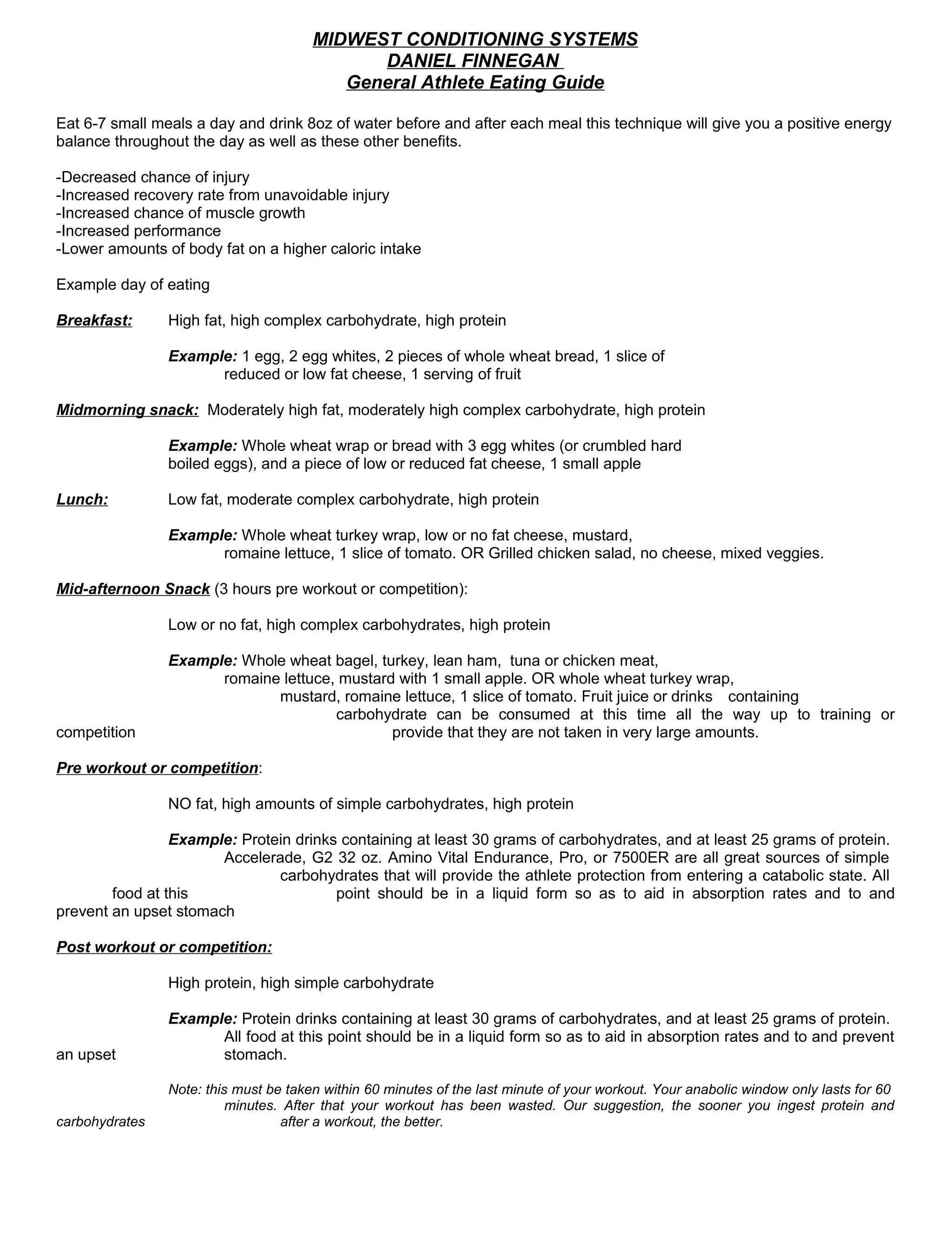 This document provides an athlete eating guide with recommendations for meal timing and composition throughout the day to support performance and recovery. It recommends eating 6-7 small meals per day with plenty of water and getting protein, carbohydrates and nutrients within 60 minutes of workouts. Sample meal plans are provided that emphasize high-quality protein, complex carbs and hydration. Supplement recommendations focus on creatine, glutamine and protein/amino acids around workouts. The effects of alcohol on performance are discussed. Maintaining proper hydration is highlighted as critical for peak athletic performance.