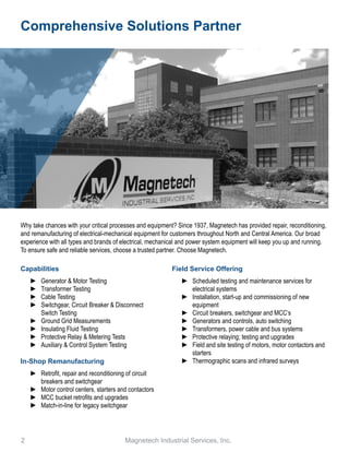 Magnetech provides electrical testing, repair, and maintenance services for equipment such as generators, motors, transformers, switchgear, and circuit breakers. They offer on-site maintenance and testing, in-shop remanufacturing and retrofitting, and have various locations throughout the Midwest and Southwestern United States. Magnetech has over 80 years of experience servicing all types and brands of electrical equipment to keep customers' operations running reliably and safely.