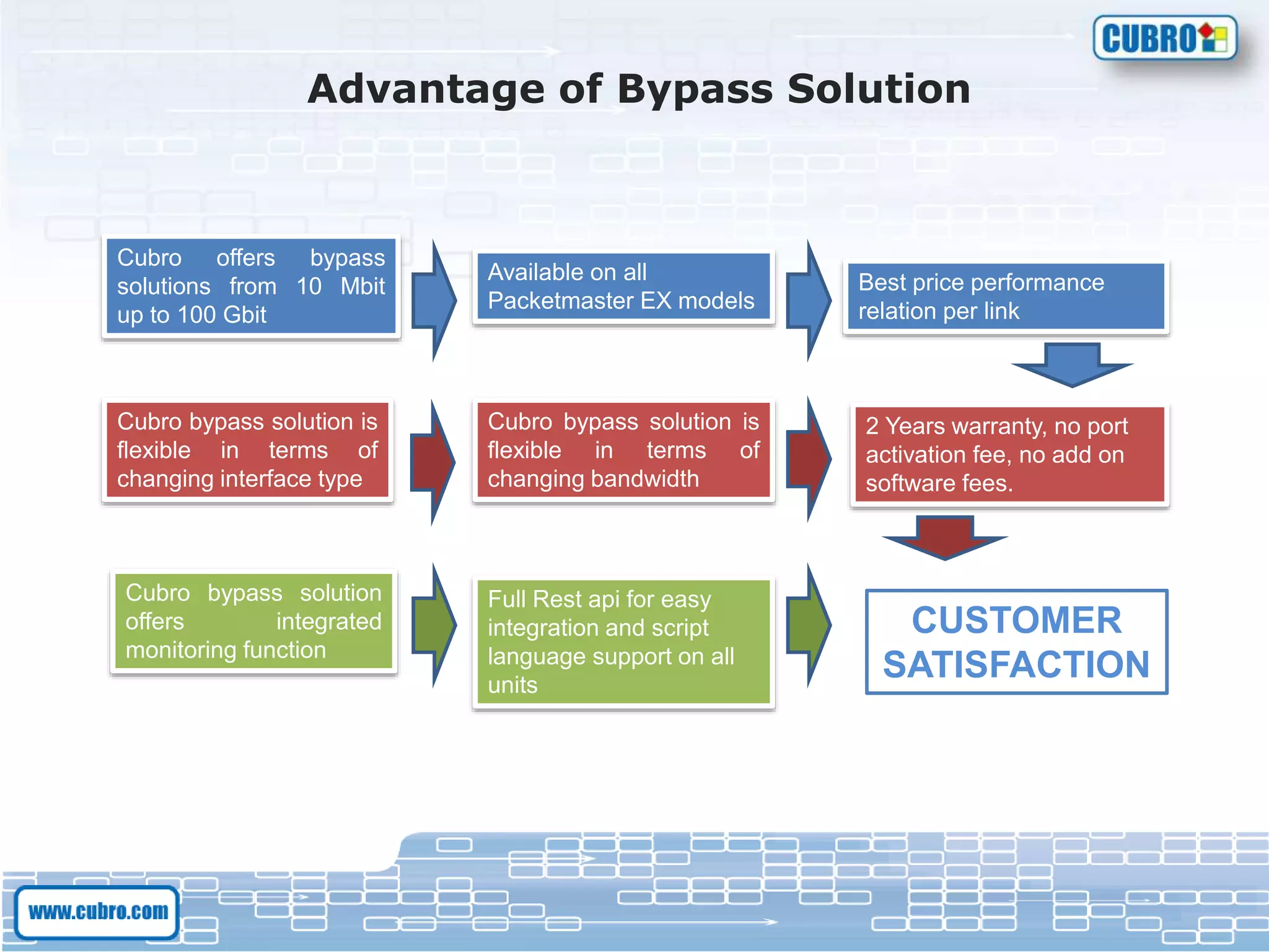 Cubro offers flexible bypass solutions for data rates from 10 Mbit to 100 Gbit, integrating monitoring functions and supporting various interface types. The Packetmaster EX models can serve as bypass switches with heartbeat functionality to ensure operational reliability and device protection. Features include user-defined heartbeat traffic, monitoring capabilities, and security options like DDoS protection and traffic filtering.
