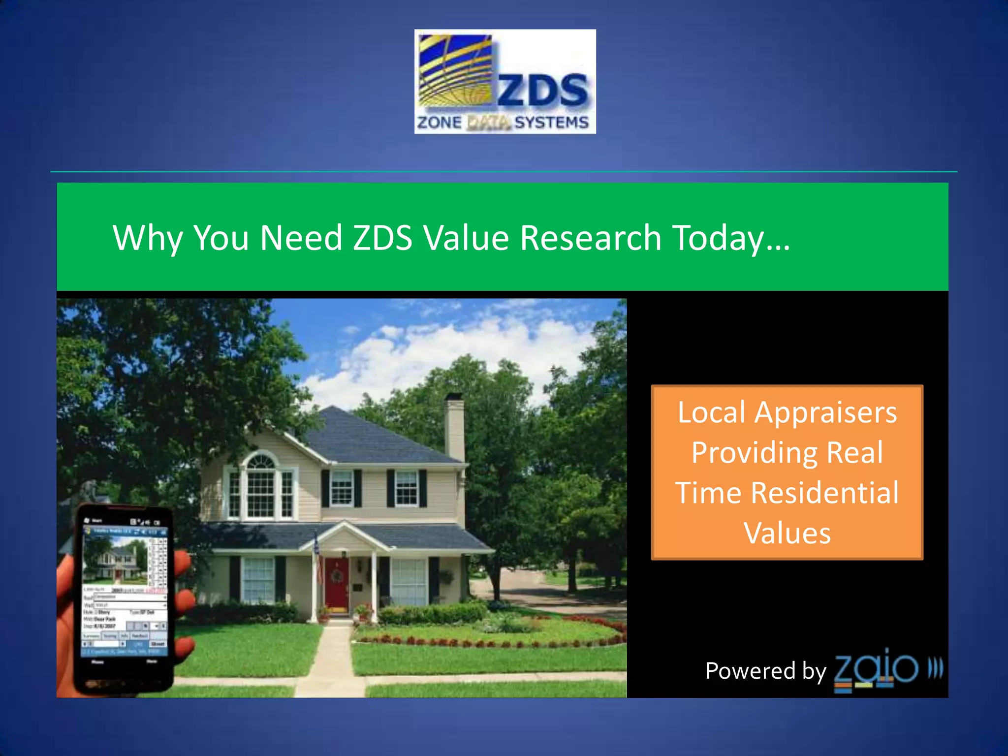 Zone Data Systems offers real-time residential property valuation services powered by their exclusive Valytics technology. Their national network of over 200 partner appraisal firms provides coverage across critical areas and uses advanced modeling to value entire markets and portfolios. Customers benefit from accurate appraised values, property reports, and monitoring of value trends over time.