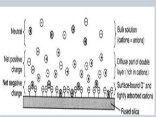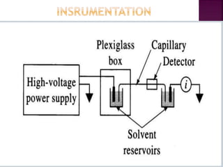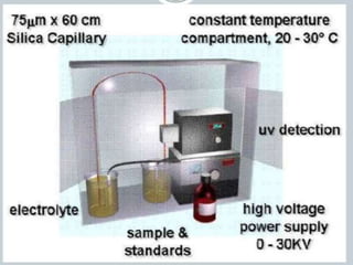 This document provides an overview of capillary electrophoresis (CE). It defines CE, describes its principle and instrumentation. CE involves separating components of a sample based on their differential rate of migration in an applied electric field. Key points covered include electrophoretic mobility, electroosmotic flow, sample introduction techniques, and common applications such as protein, DNA and pharmaceutical analysis. CE provides high resolution separations due to its small capillary diameter and long separation length.